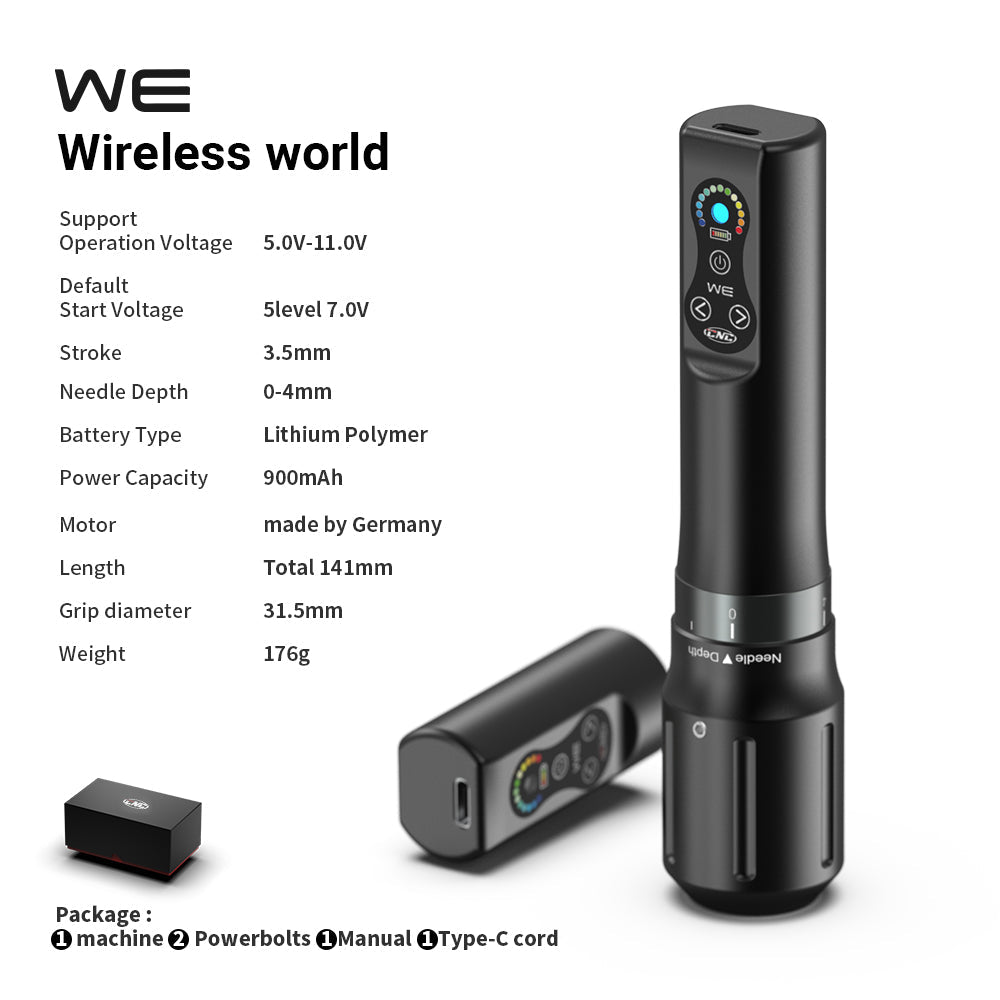 In my opinion this machine is outstanding and for reasons that I demonstrate in this video. I pull really smooth and saturated lines with multiple sizes of needles, I use a pepper like shading, and I have packed black. To me the CNC-WE is a workhorse tattoo machine because pretty much anything can be achieved with correct technique and application. I say the CNC-WE Tattoo Machine is TRULY wireless because there is no place to plug in our power supply. The WE runs off of the power bolts that come with the machine, which also in my opinion are very powerful and can be good depending on setup and application. The CNC-WE is a continuously running machine, for this I feel it's all person preference.