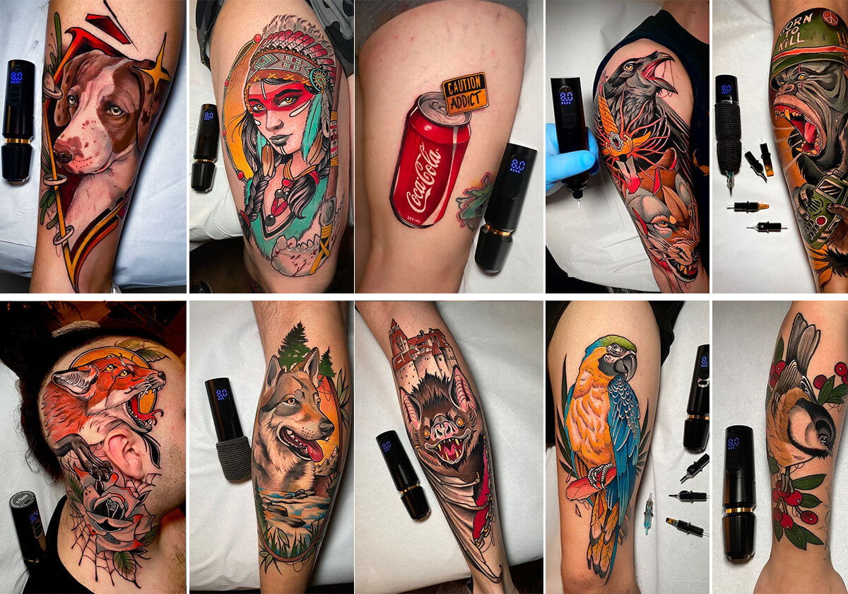 How to visualize the machine’s operating speed? Assuming that the tattoo needle from the highest point to the lowest point of the movement we call a cycle, color packing in a suitable operating speed is 90-100 cycles per second. This is an average value given by experienced tattoo artists. If too fast continuous speed is applied to the skin, it will lead to skin damage and bleeding, and also affect the effect of the color packing. The right machine speed with an even hand speed will maximize the effect of color packing, and adjusting the machine’s operating voltage will allow this to happen.