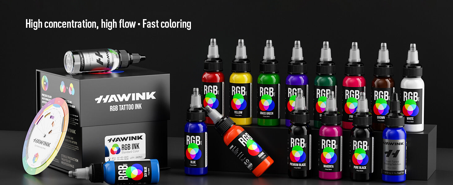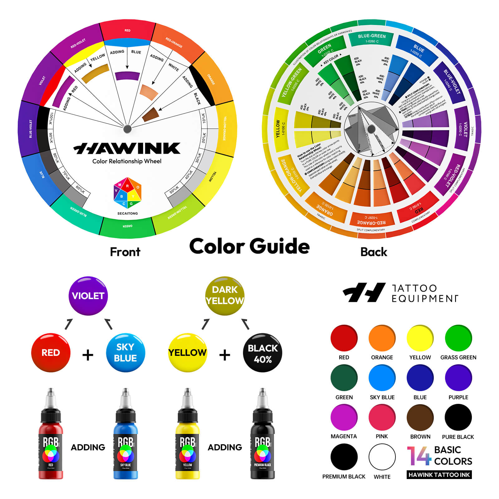 HAWINK’s upgraded tattoo ink kit includes 14 highly pigmented colors plus 2 professional mixing solutions. The set covers all essential shades like red, orange, yellow, green, blue, purple, black, and white—perfect for any tattoo style.