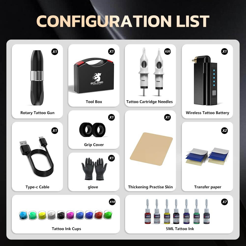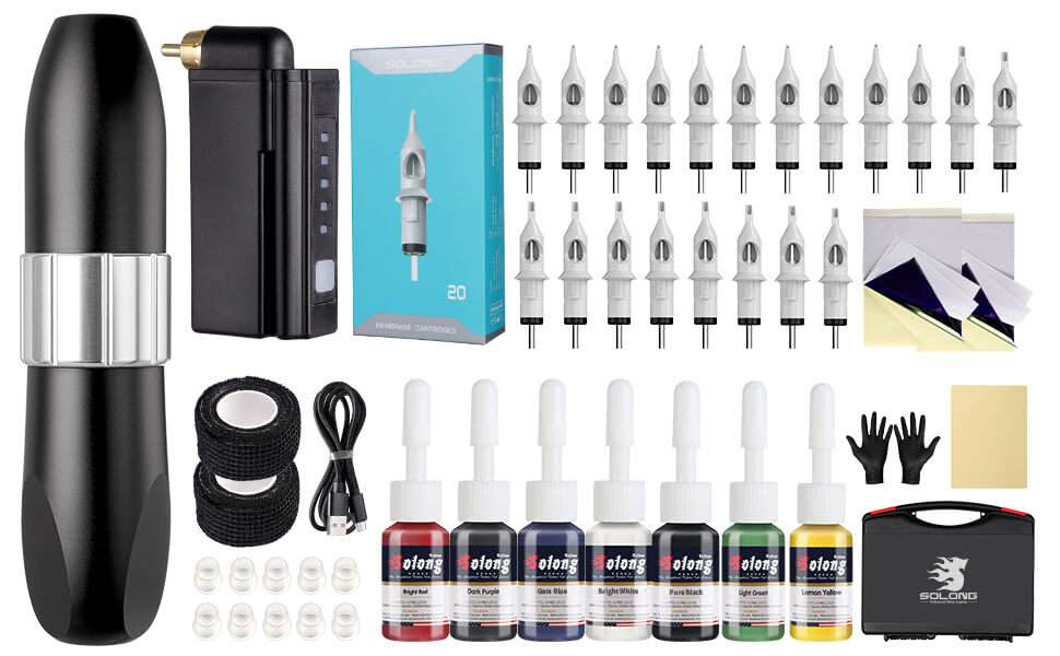This complete Solong tattoo kit includes a wireless rotary tattoo pen, RCA cord, power supply, tattoo ink, cartridge needles, and essential tattoo accessories. Everything you need to start tattooing is in one box.