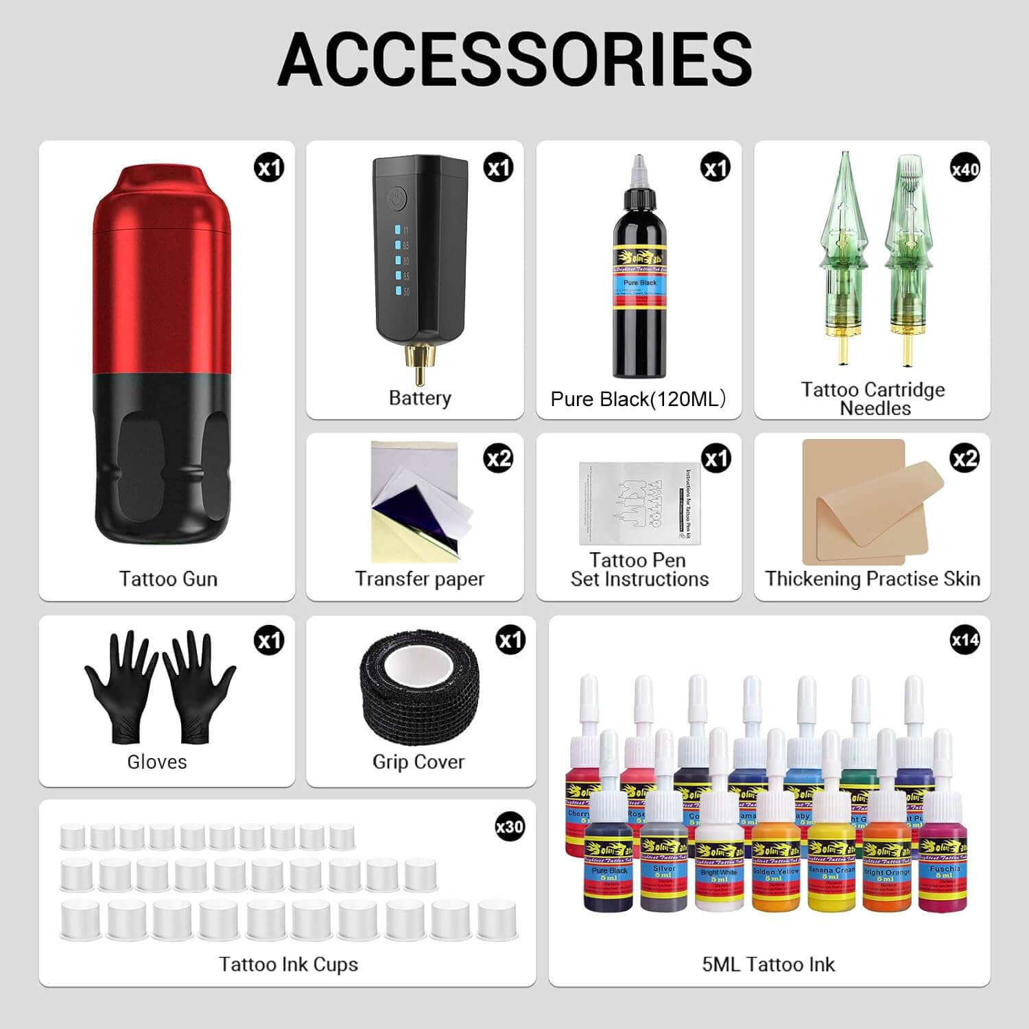 The Solong tattoo kit includes everything you need to start tattooing: a wireless rotary tattoo pen, upgraded power supply, 40 cartridge needles, 120ml black tattoo ink, 14 color inks, and other essential tattoo accessories.