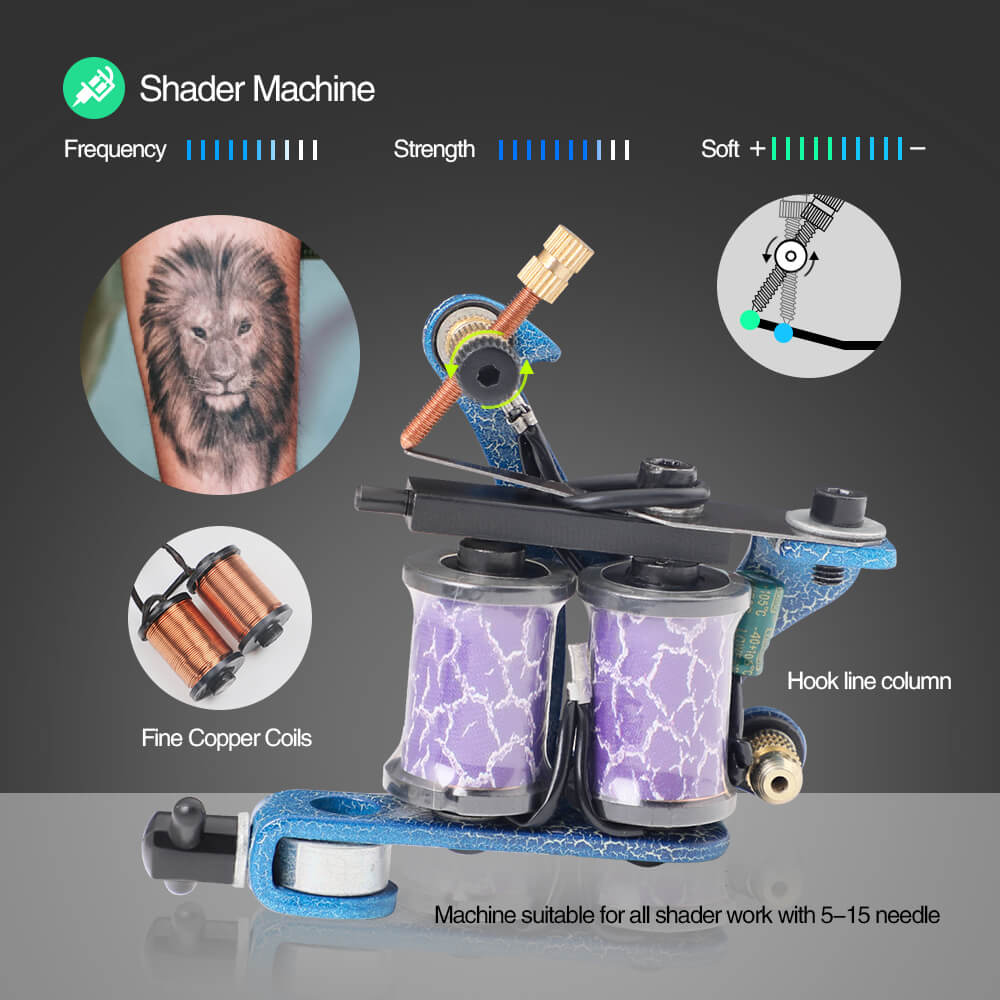The Solong coil machines offer a high level of adjustability and customization, ideal for both experienced artists and tattoo beginners alike. This tattoo coil machine kit boasts a more reliable burst of power, ensuring the machine operates with increased force and continuity. It delivers a consistent and potent power supply, allowing for more defined lines and a bolder style of packing in colors.