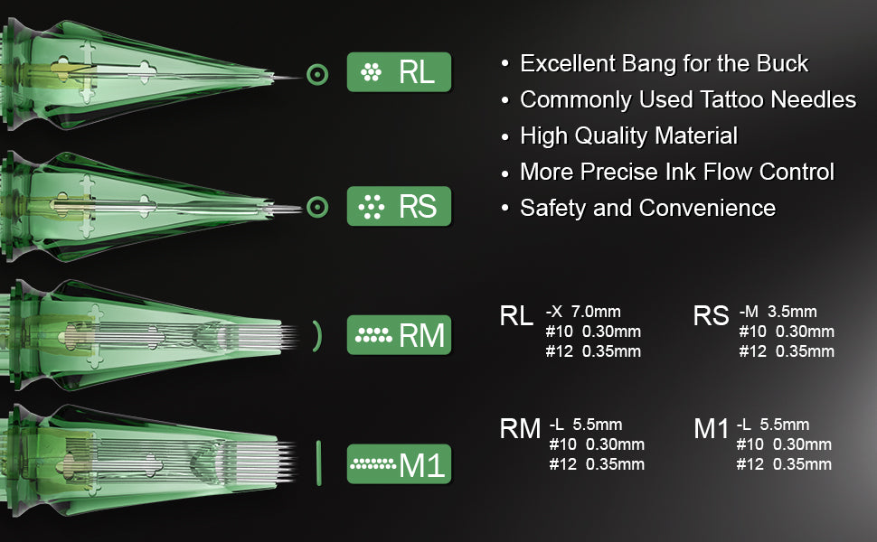 Solong VITALITY NEW green tattoo needle cartridges, same as the King’s Sword series, with sharper and stronger penetrating power. They run smoothly, save more ink, and provide fast color. Compatible with most Solong tattoo machines.